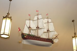 The custom of hanging a model sailing vessel from the ceiling in the central part of the church is widespread in Danish and Danish-American churches. The first record of a Danish kirkskibe (church ship) was about 1560 in the Church of St. Olav at Elsinore. One of the oldest surviving models dates from the early 1600s and hangs in the Ho Church, on the west coast of Denmark.