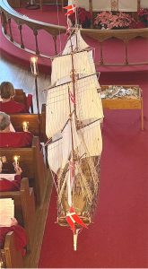 In 1994, the West Denmark worship committee and council recommended that a model Danish ship be built and hung in our church. The ship was built by Erling Grumstrup and funded by Ferna Holdt.The ship is patterned after the Norwegian Lion Battleship, which was built in 1765 at a time when Norway was under Danish rule. The ship was 176 feet long and 45 feet wide. It had a crew of 667 and contained 70 cannons.